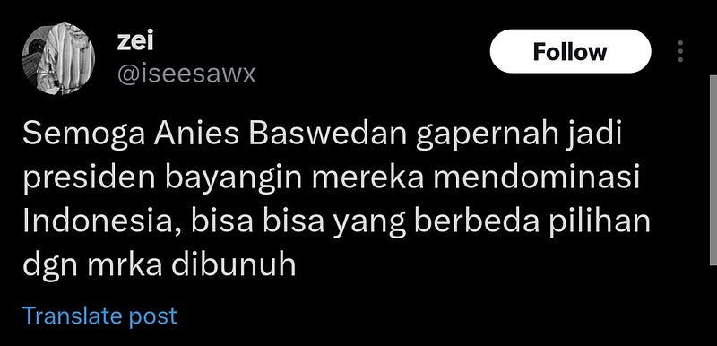 Like just look at these words uttered by these voters, man. It doesn’t sound very peaceful and innocent to me. The connotation that Anies would kill people for being different in what they believe in when their people are actively and openly calling for him to be shot or for children to be Soeharto’d out of existence for being ungrateful towards their mediocre free lunches. Quite the significant double standard me thinks. Not to mention the way they respond to critiques of their government. Using buzzers paid by our tax rupiahs to influence the public discourse on the 12% VAT hike and many other issues. All showing their own aggression towards any form of legitimate critiques from voters of other candidates and even political watchers and experts.