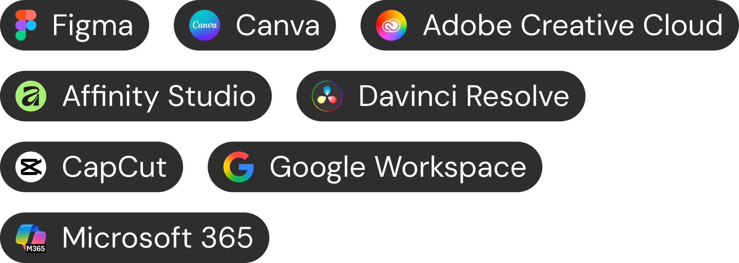 Canva, Figma, DaVinci Resolve, Edits by Meta, Instagram for Business, OBS Studio, WordPress with Divi and Elementor, Zoom Meetings, Google Workspace, Office 365